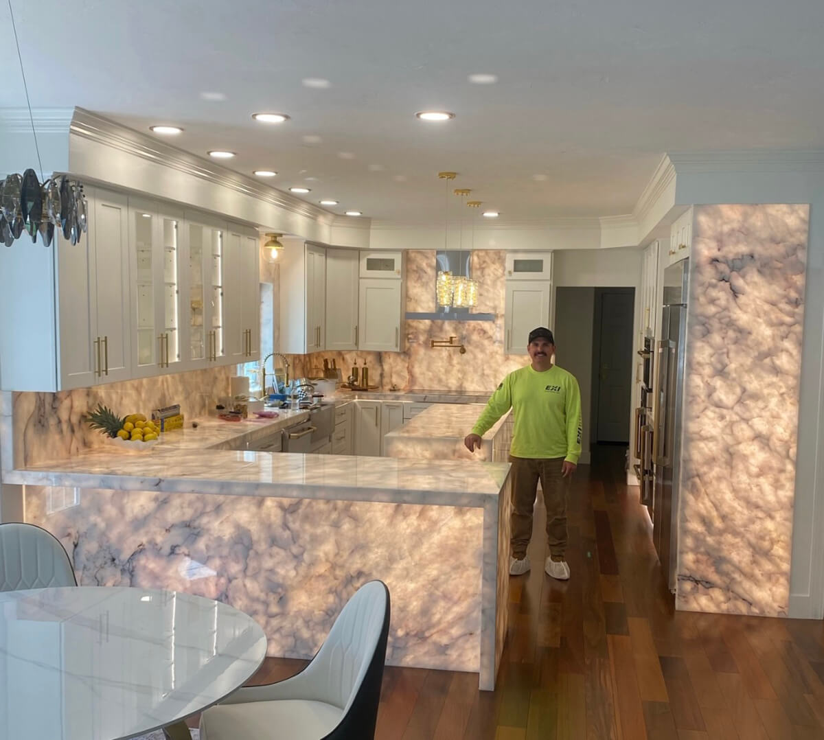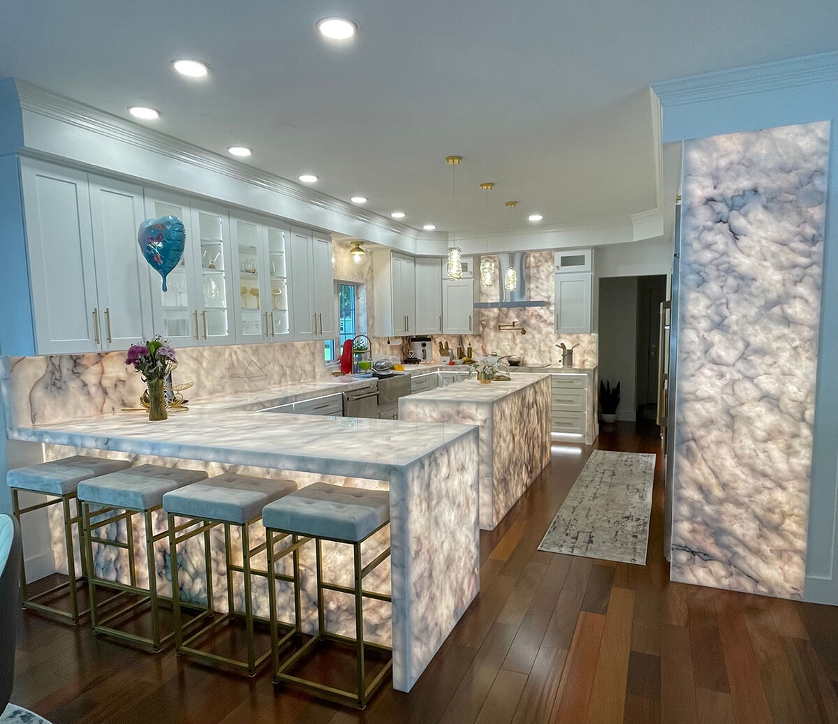 Recently completed custom kitchen renovation with back-lit stone countertops and back-lit solid stone backsplashes, as well as a LUTRON RadioRA3 smart lighting control system.